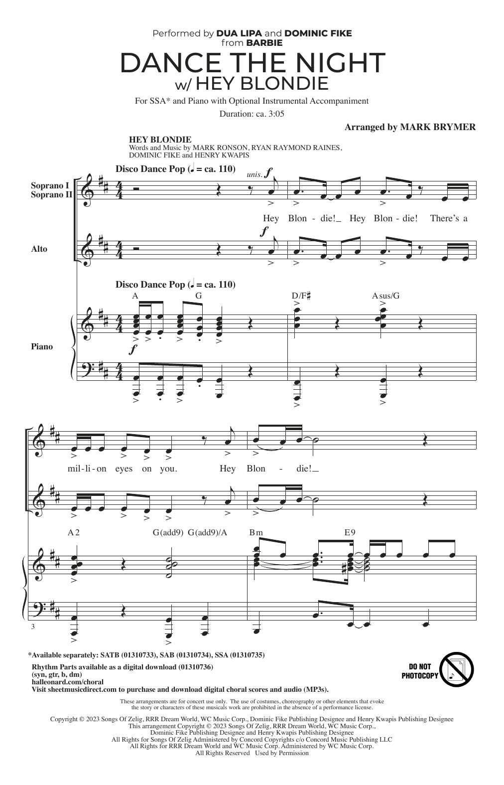 Download or print Dua Lipa and Dominic Fike Dance The Night (with "Hey Blondie") (from Barbie) (arr. Mark Brymer) sheet music, chords and digital score arranged for SSA Choir. This Disco score includes 14 page(s).