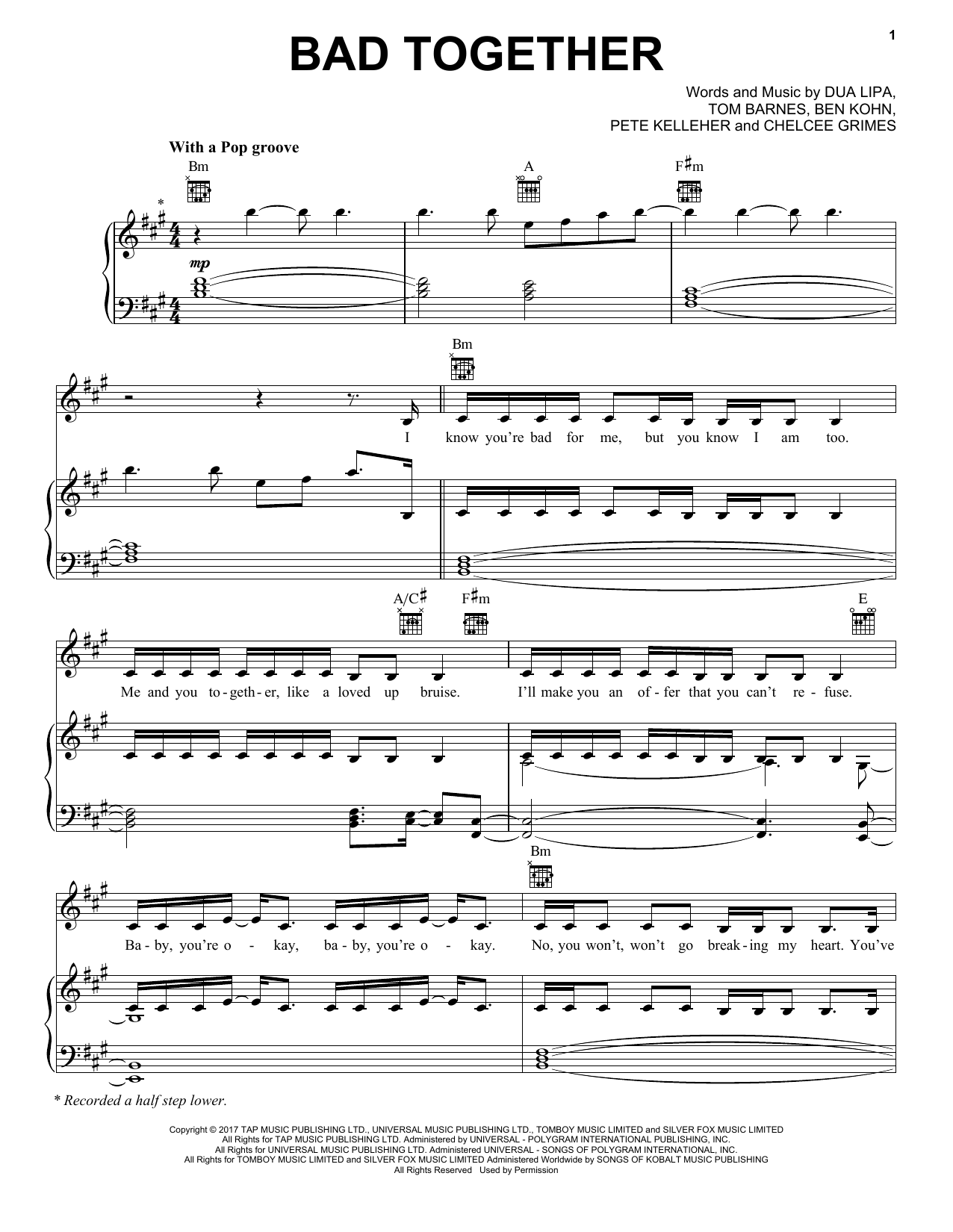 Download or print Dua Lipa Bad Together sheet music, chords and digital score arranged for Piano, Vocal & Guitar Chords (Right-Hand Melody). This Pop score includes 8 page(s).