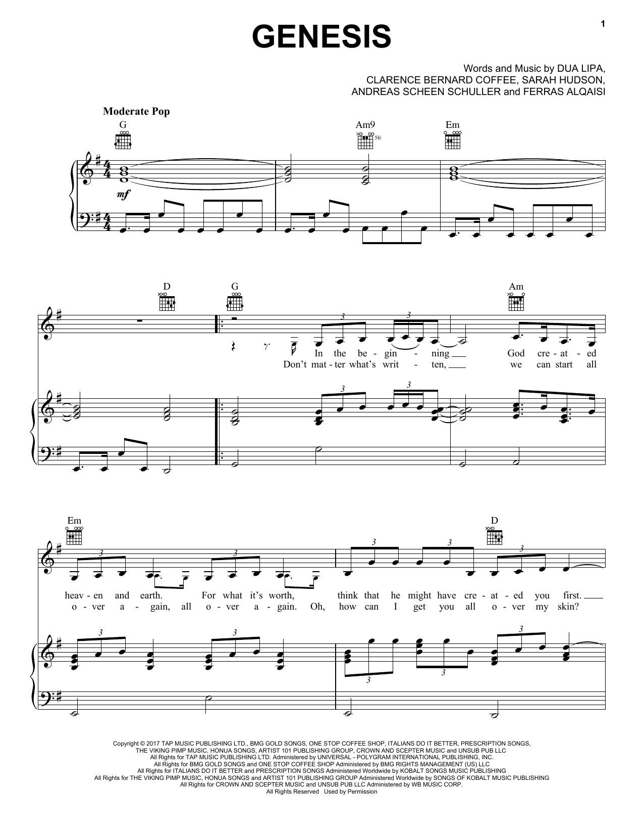 Download or print Dua Lipa Genesis sheet music, chords and digital score arranged for Piano, Vocal & Guitar Chords (Right-Hand Melody). This Pop score includes 5 page(s).