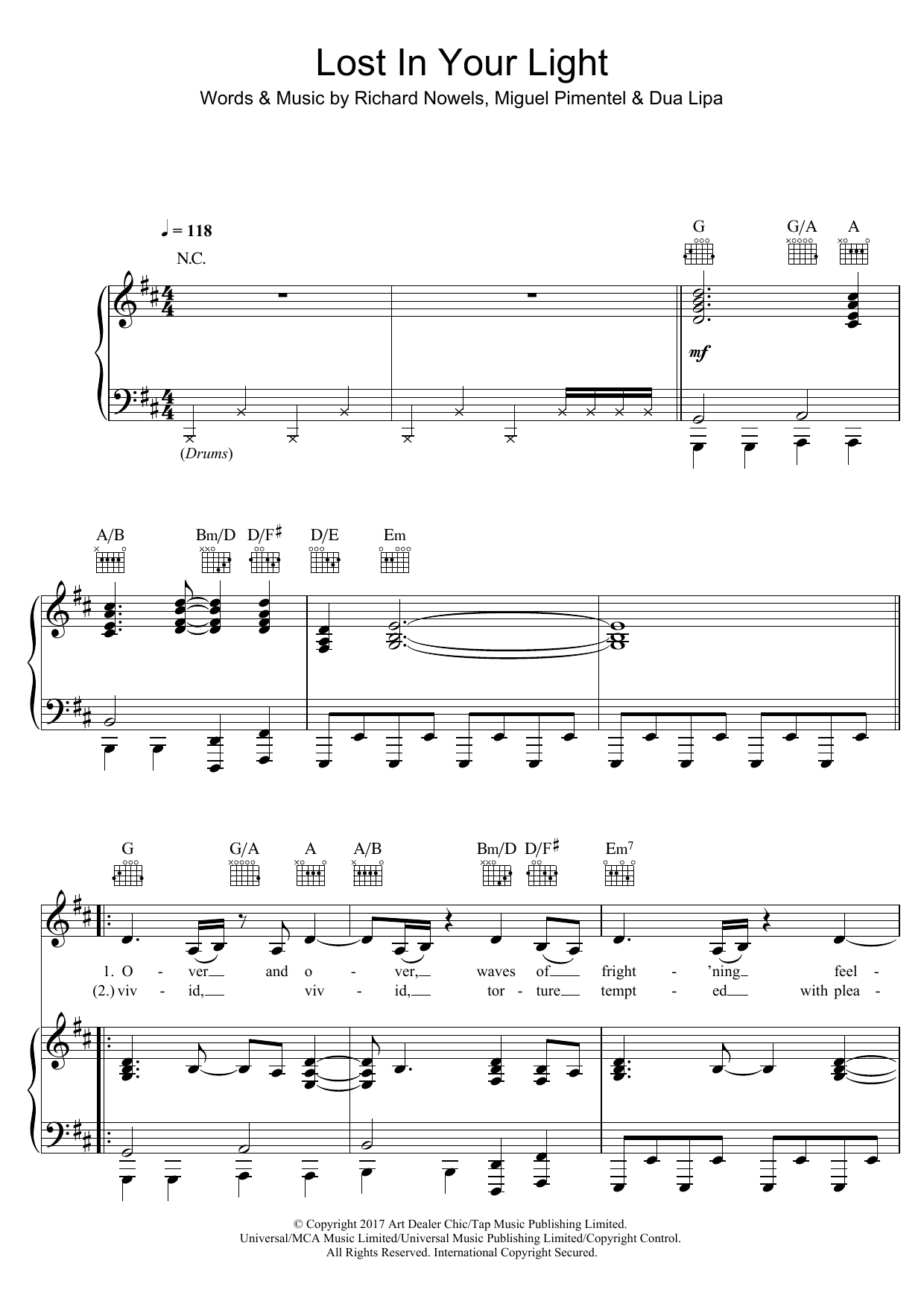 Download or print Dua Lipa Lost In Your Light (featuring Miguel) sheet music, chords and digital score arranged for Piano, Vocal & Guitar Chords (Right-Hand Melody). This Pop score includes 6 page(s).