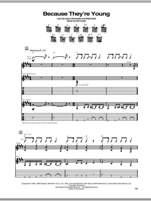 Download or print Duane Eddy Because They're Young sheet music, chords and digital score arranged for Guitar Tab. This Pop score includes 6 page(s).