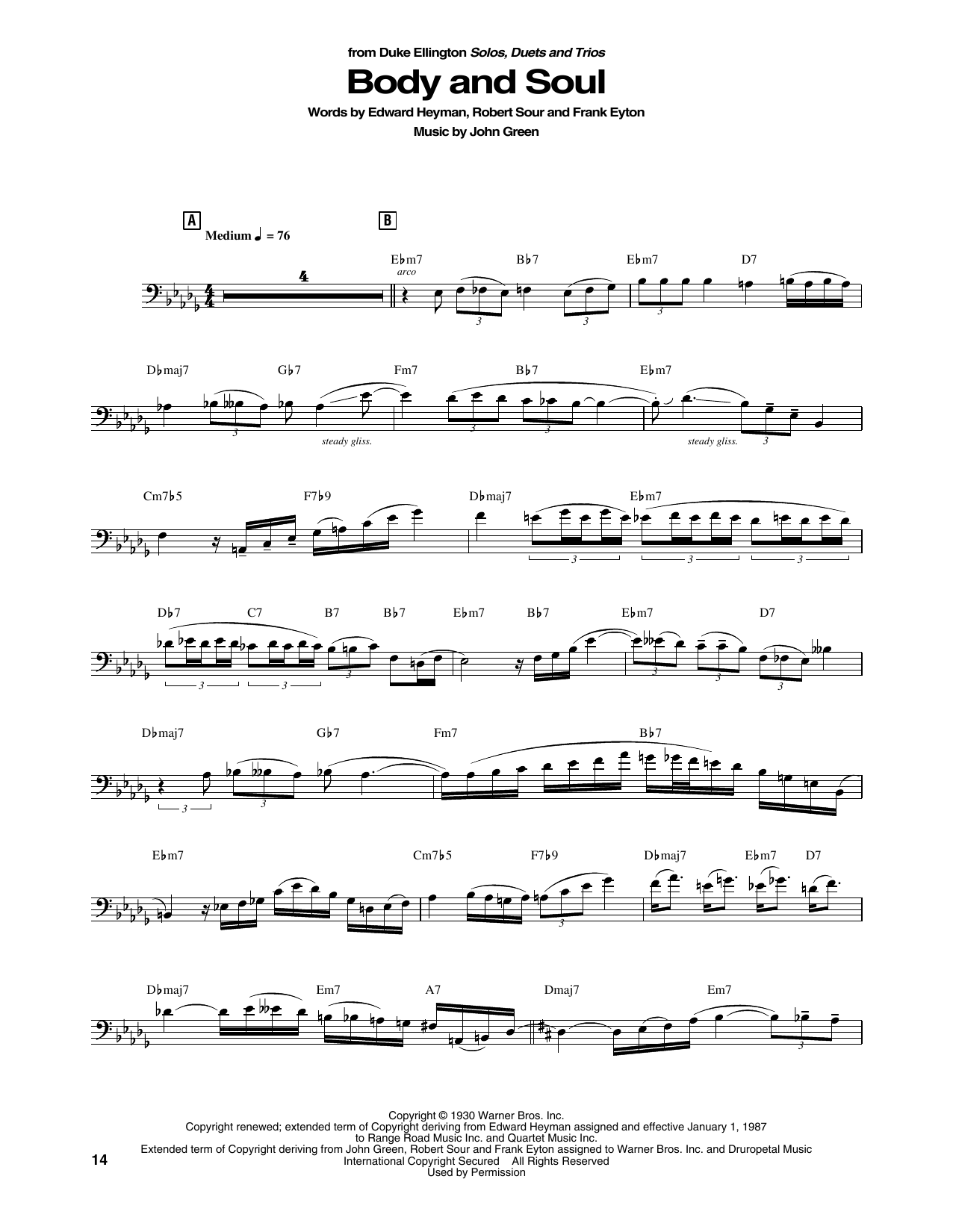 Download or print Duke Ellington Body And Soul sheet music, chords and digital score arranged for String Bass Transcription. This Jazz score includes 3 page(s).