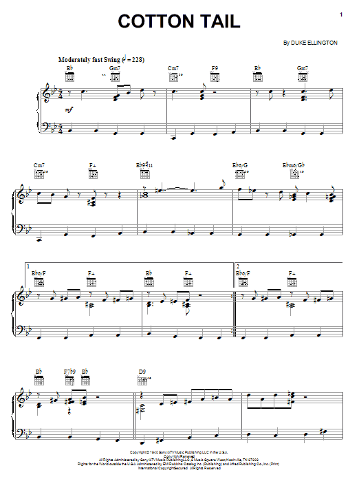 Download or print Duke Ellington Cotton Tail sheet music, chords and digital score arranged for Piano, Vocal & Guitar Chords (Right-Hand Melody). This Jazz score includes 2 page(s).