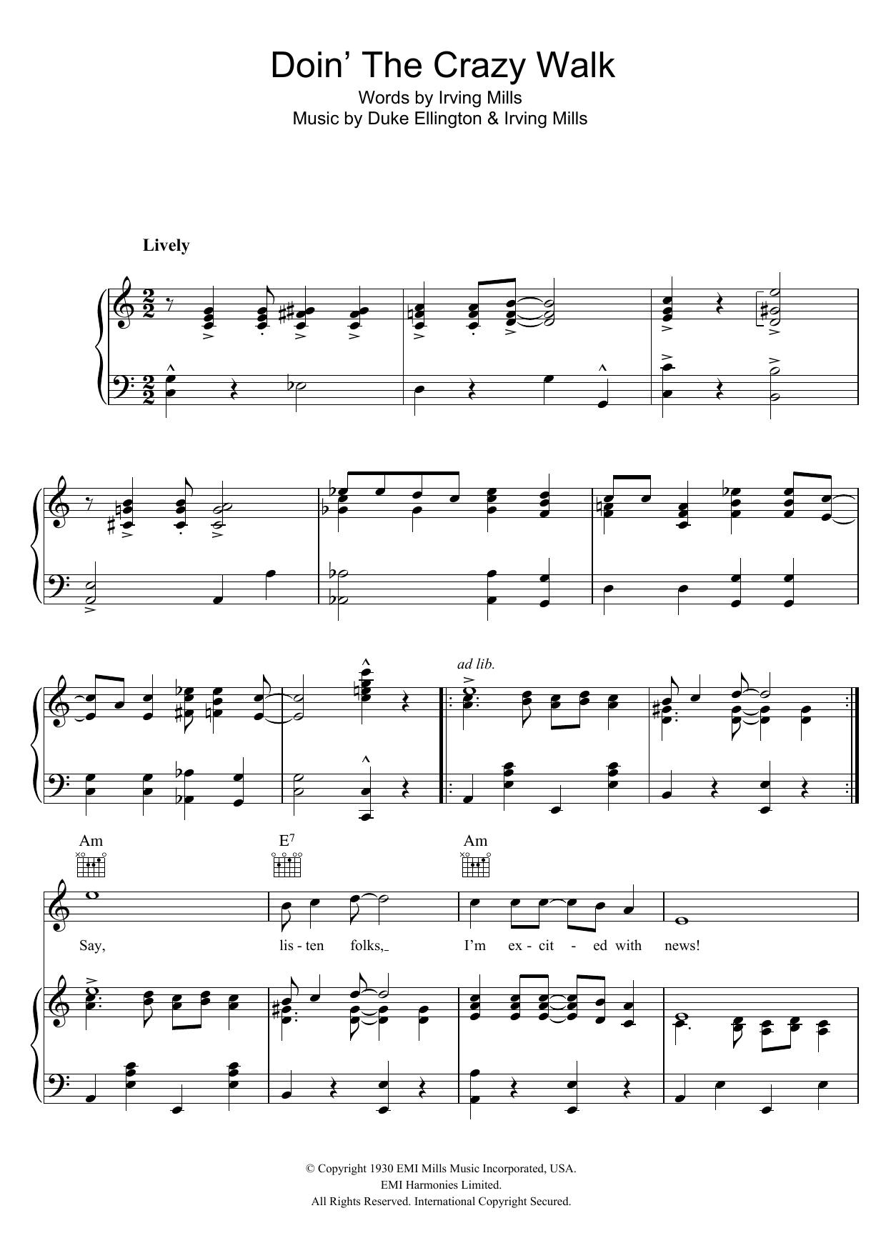 Download or print Duke Ellington Doin' The Crazy Walk sheet music, chords and digital score arranged for Piano, Vocal & Guitar Chords. This Standards score includes 4 page(s).