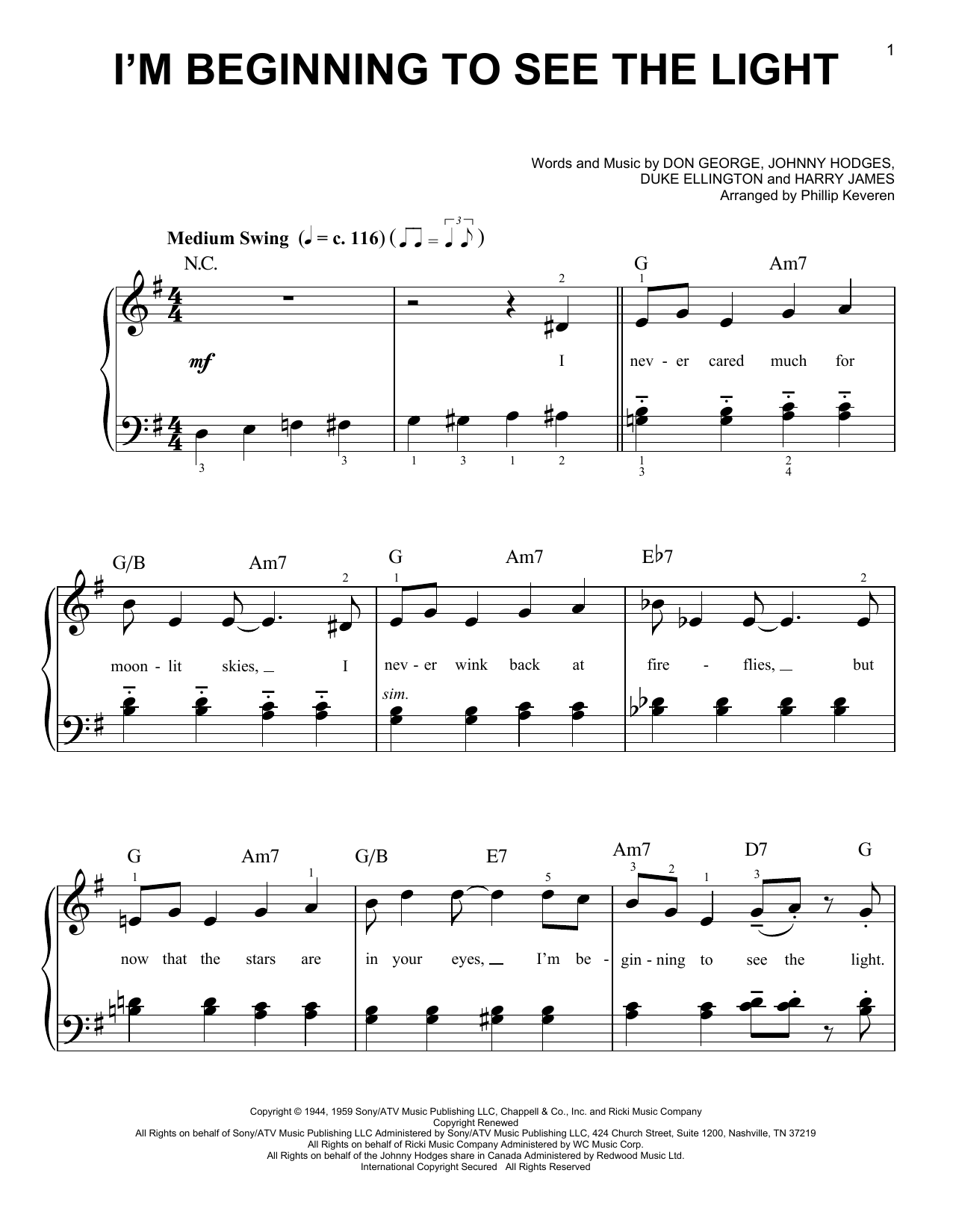Download or print Duke Ellington I'm Beginning To See The Light (arr. Phillip Keveren) sheet music, chords and digital score arranged for Easy Piano. This Jazz score includes 3 page(s).