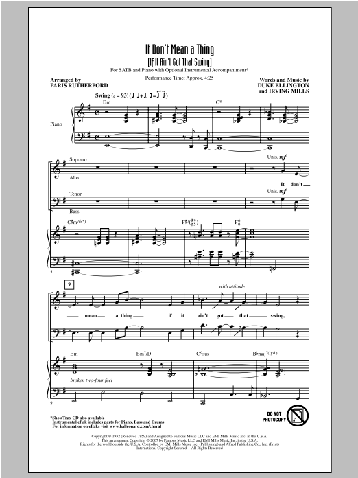 Download or print Paris Rutherford It Don't Mean A Thing (If It Ain't Got That Swing) sheet music, chords and digital score arranged for SATB Choir. This Jazz score includes 15 page(s).
