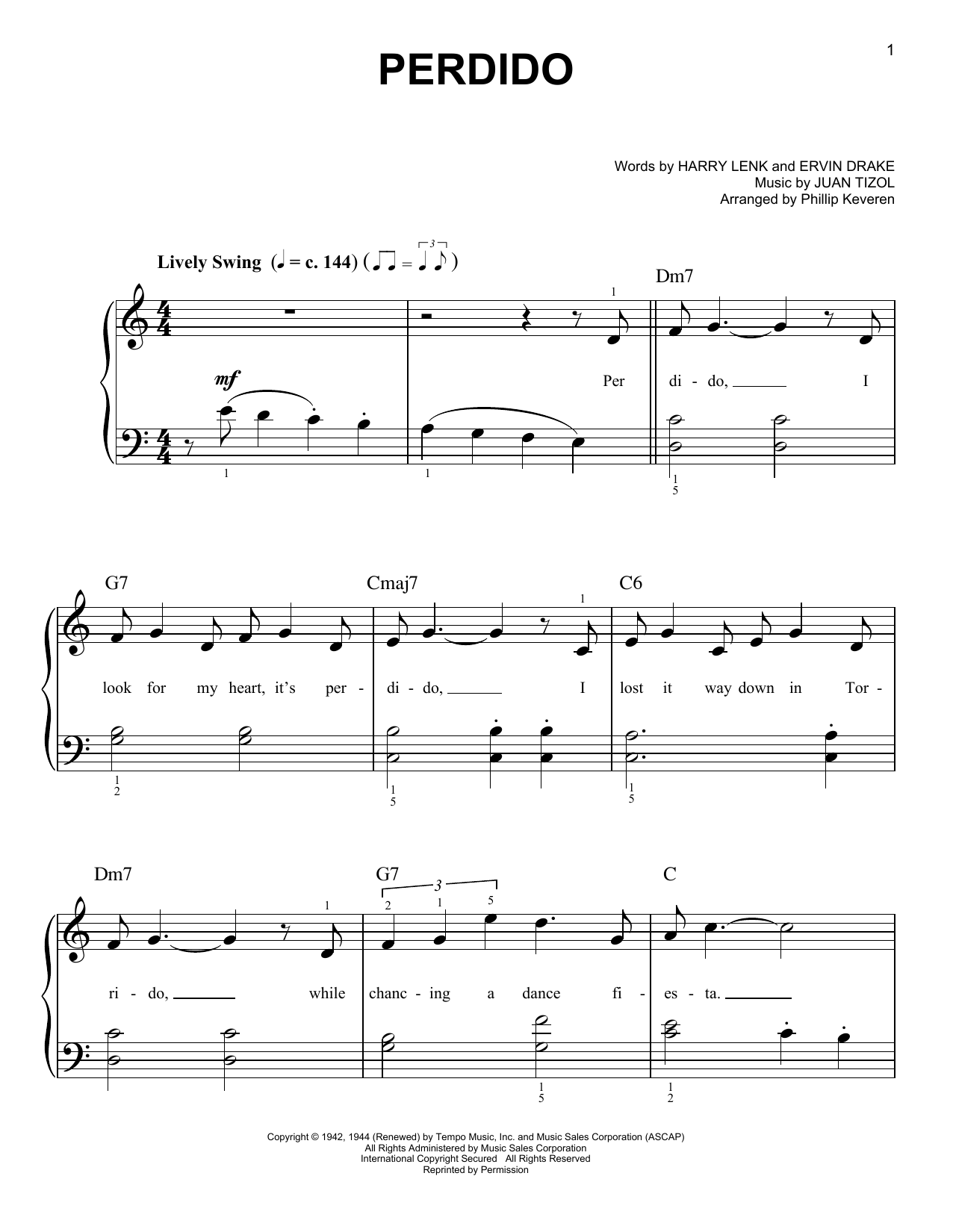 Download or print Duke Ellington Perdido (arr. Phillip Keveren) sheet music, chords and digital score arranged for Easy Piano. This Jazz score includes 3 page(s).
