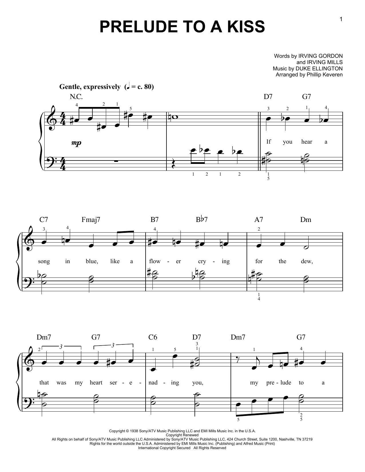 Download or print Duke Ellington Prelude To A Kiss (arr. Phillip Keveren) sheet music, chords and digital score arranged for Easy Piano. This Jazz score includes 3 page(s).