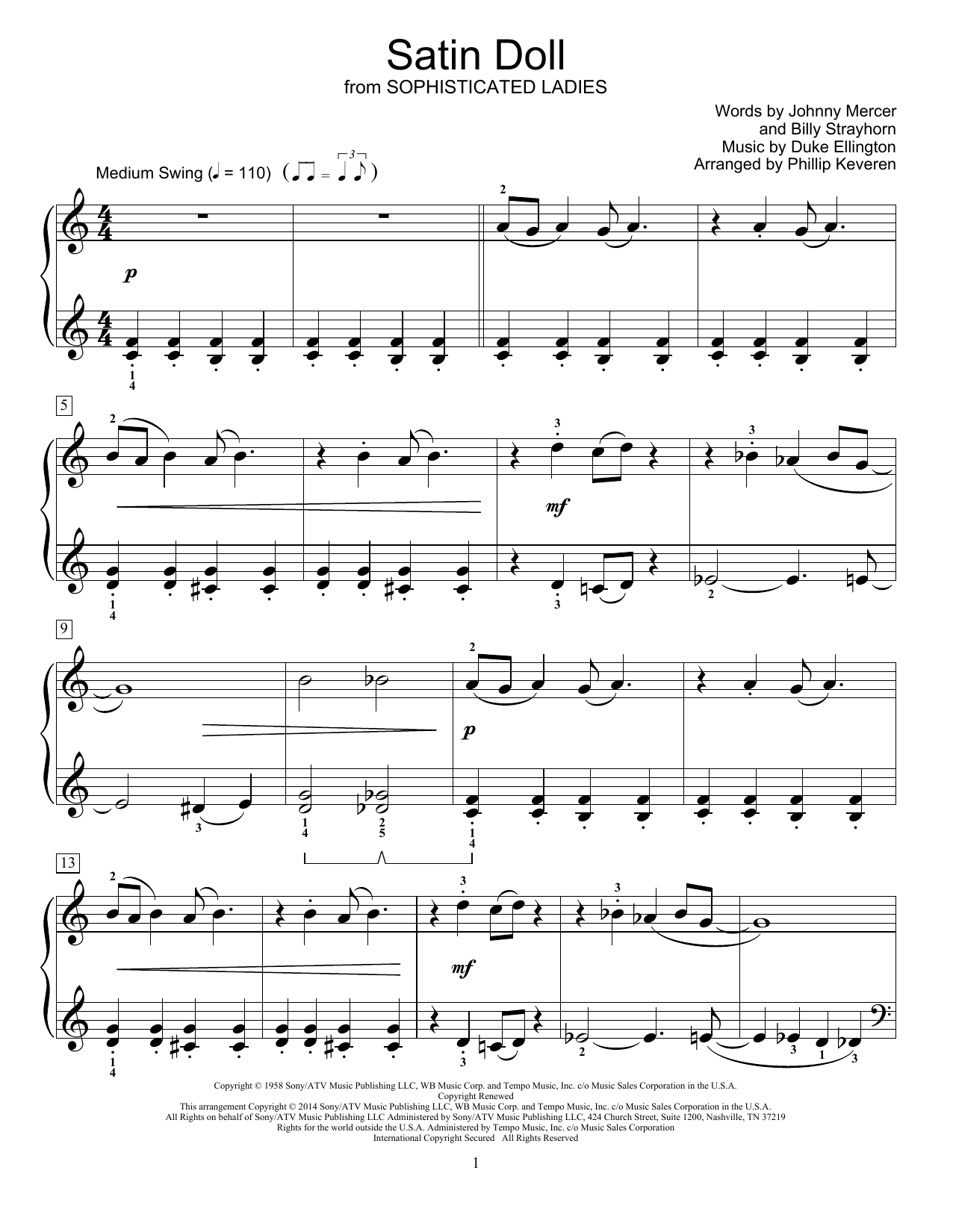 Download or print Duke Ellington Satin Doll (arr. Phillip Keveren) sheet music, chords and digital score arranged for Easy Piano. This Jazz score includes 3 page(s).