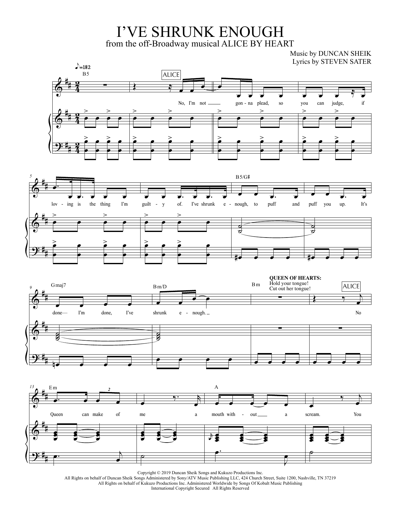 Download or print Duncan Sheik and Steven Sater I've Shrunk Enough (from Alice By Heart) sheet music, chords and digital score arranged for Piano & Vocal. This Musical/Show score includes 8 page(s).