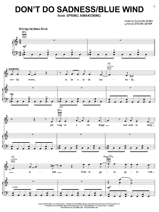 Download or print Duncan Sheik Don't Do Sadness/Blue Wind sheet music, chords and digital score arranged for Piano, Vocal & Guitar Chords (Right-Hand Melody). This Musical/Show score includes 11 page(s).