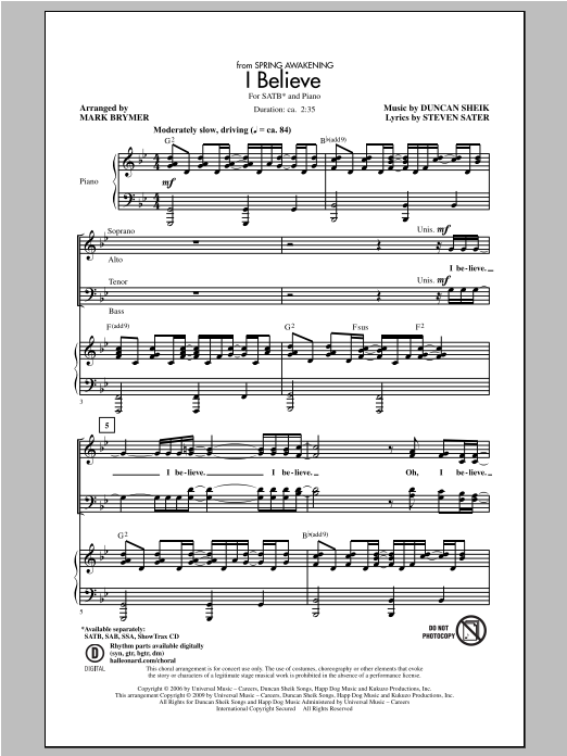 Download or print Mark Brymer I Believe (from Spring Awakening) sheet music, chords and digital score arranged for SAB Choir. This Broadway score includes 10 page(s).