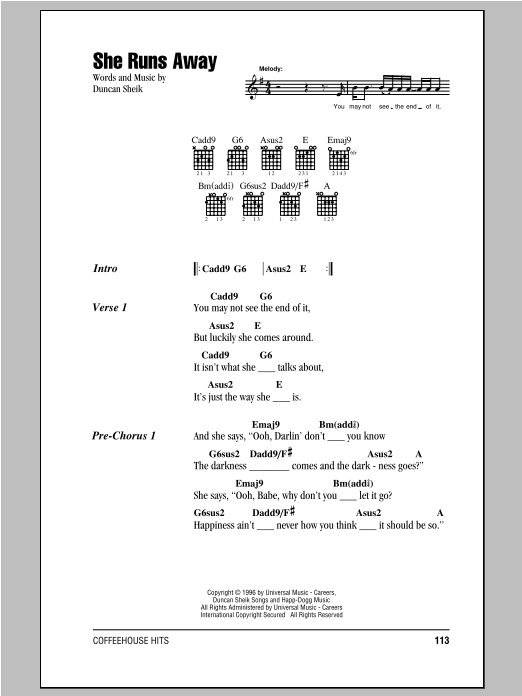 Download or print Duncan Sheik She Runs Away sheet music, chords and digital score arranged for Piano, Vocal & Guitar Chords (Right-Hand Melody). This Folk score includes 5 page(s).