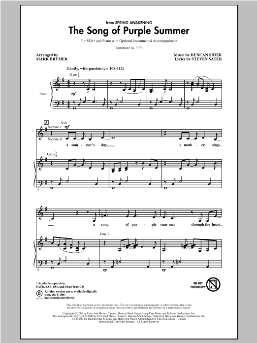 Download or print Mark Brymer The Song Of Purple Summer sheet music, chords and digital score arranged for SAB Choir. This Concert score includes 10 page(s).