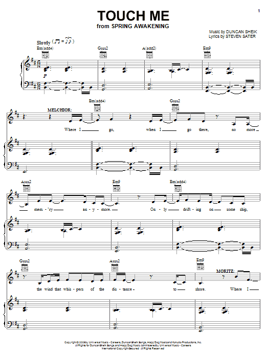 Download or print Duncan Sheik Touch Me sheet music, chords and digital score arranged for Piano, Vocal & Guitar Chords (Right-Hand Melody). This Musical/Show score includes 8 page(s).