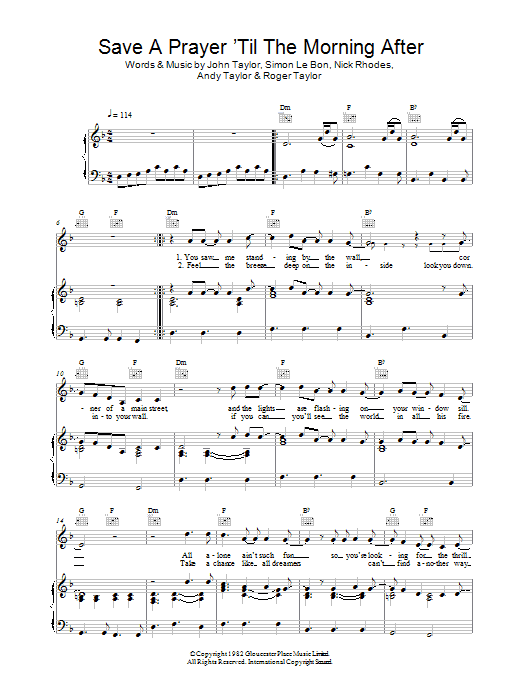 Download or print Duran Duran Save A Prayer Til The Morning After sheet music, chords and digital score arranged for Guitar Chords/Lyrics. This Pop score includes 2 page(s).