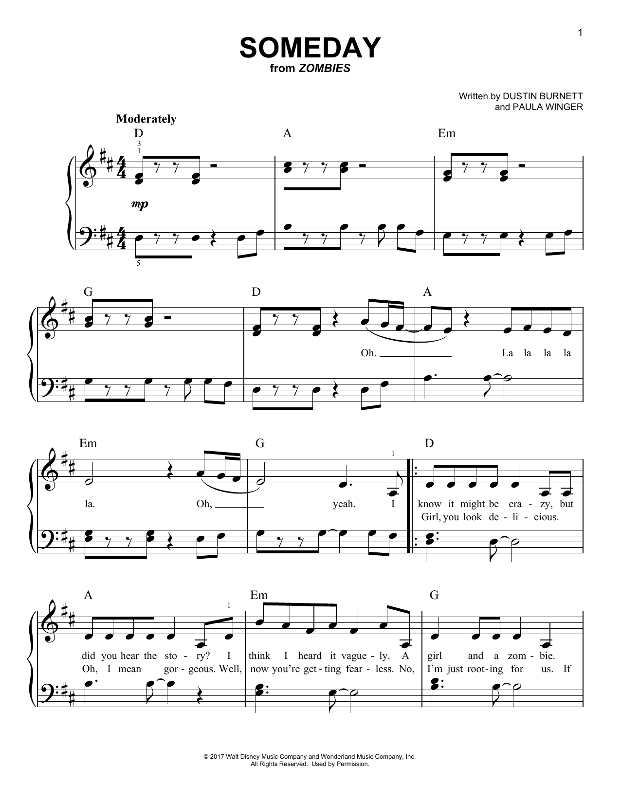 Download or print Dustin Burnett Someday (from Disney's Zombies) sheet music, chords and digital score arranged for Easy Piano. This Disney score includes 5 page(s).