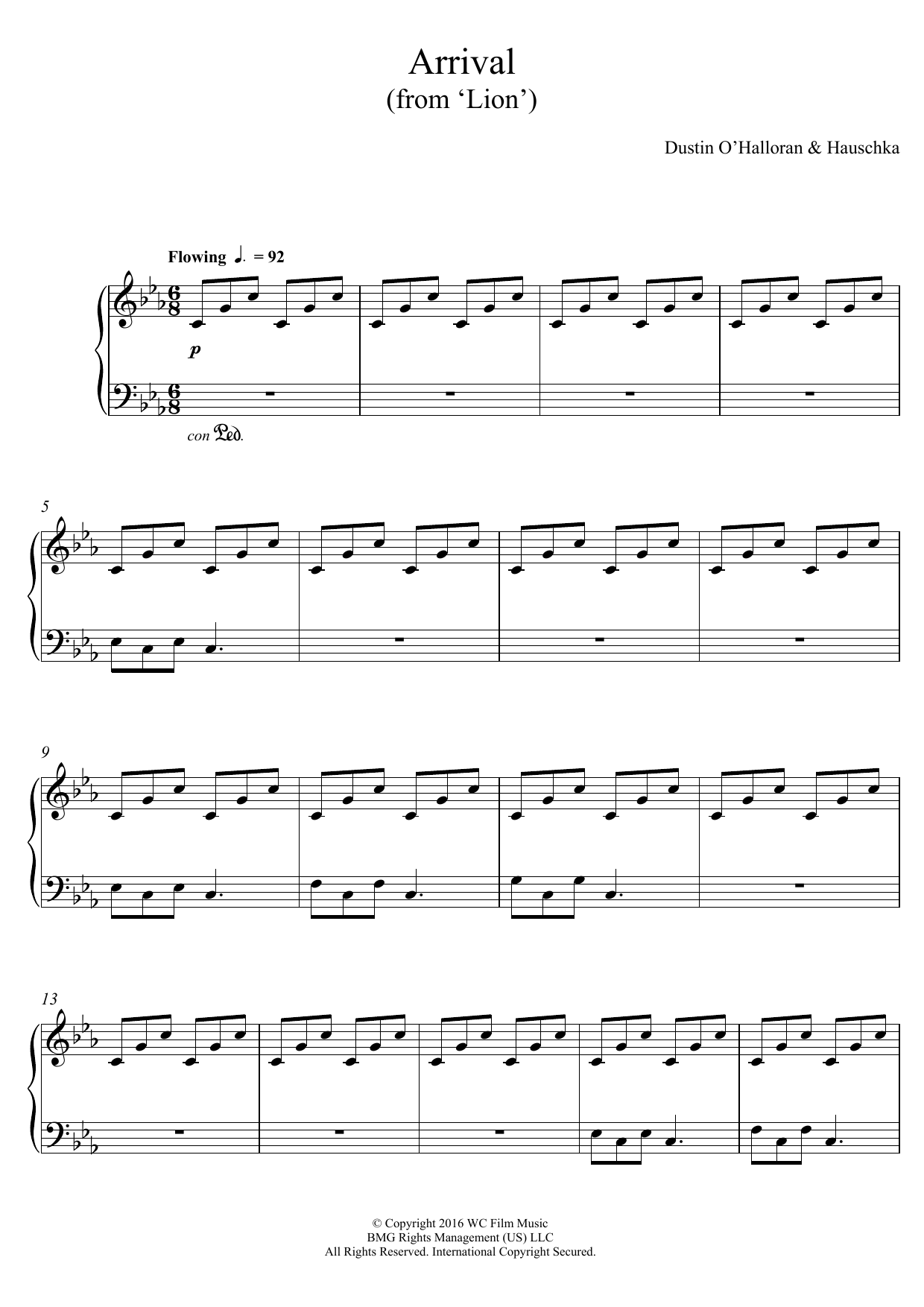 Download or print Dustin O'Halloran Arrival (from Lion) sheet music, chords and digital score arranged for Piano Solo. This Film/TV score includes 8 page(s).