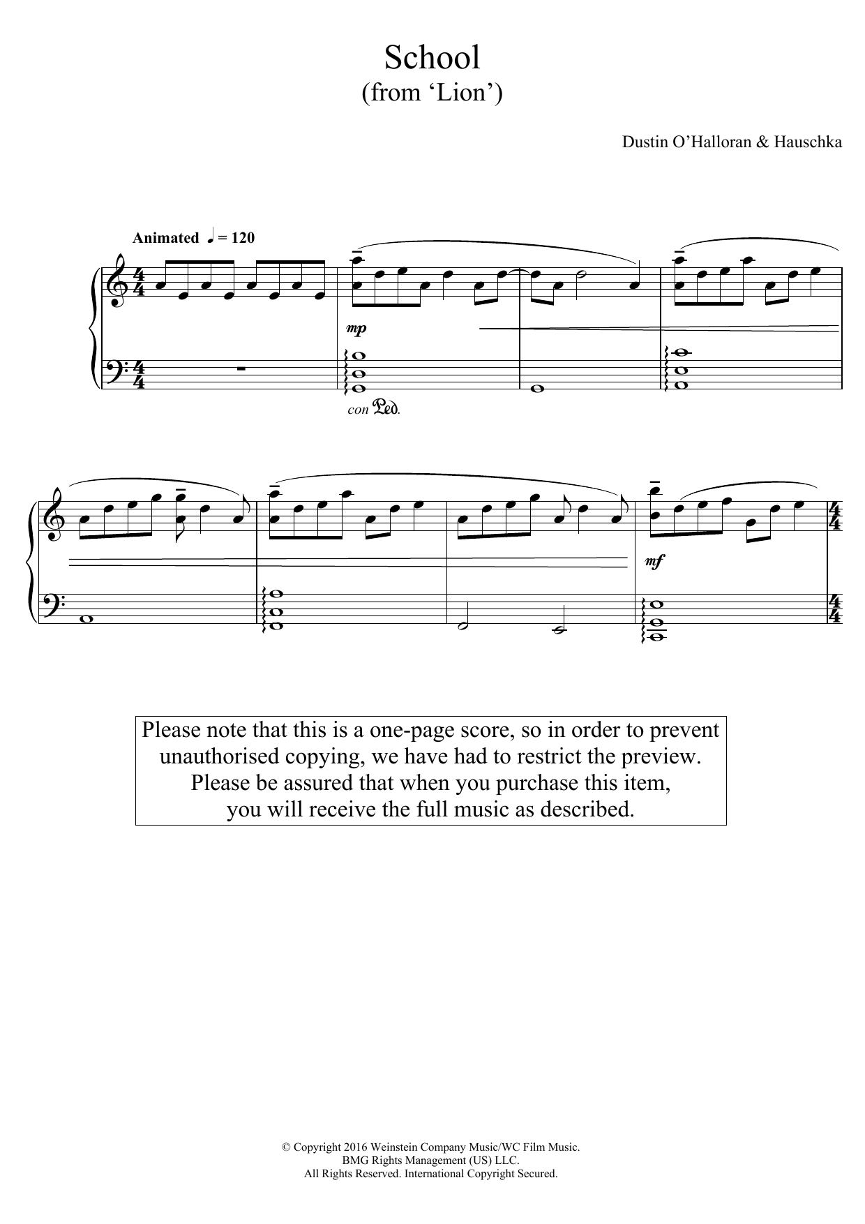 Download or print Dustin O'Halloran School (from 'Lion') sheet music, chords and digital score arranged for Piano Solo. This Film/TV score includes 2 page(s).