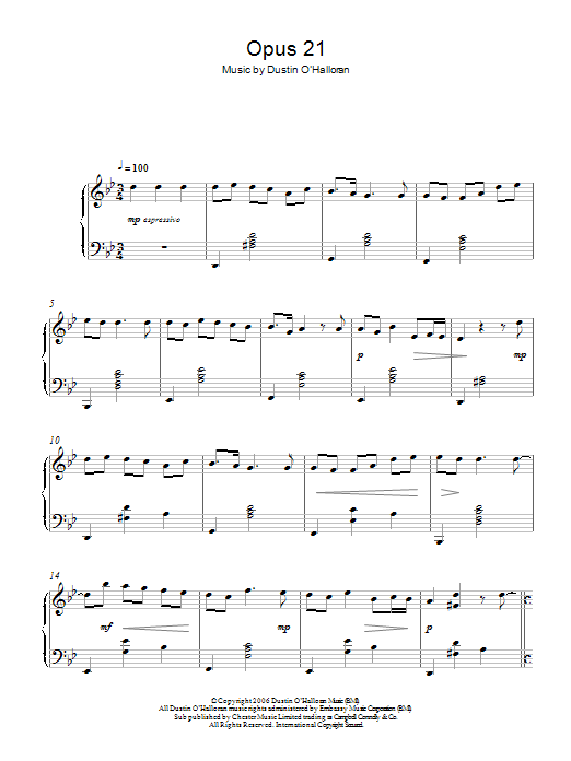 Download or print Dustin O'Halloran Opus 21 sheet music, chords and digital score arranged for Piano Solo. This Classical score includes 4 page(s).