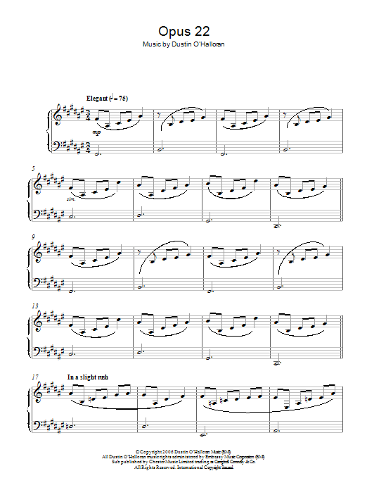 Download or print Dustin O'Halloran Opus 22 sheet music, chords and digital score arranged for Piano Solo. This Classical score includes 2 page(s).