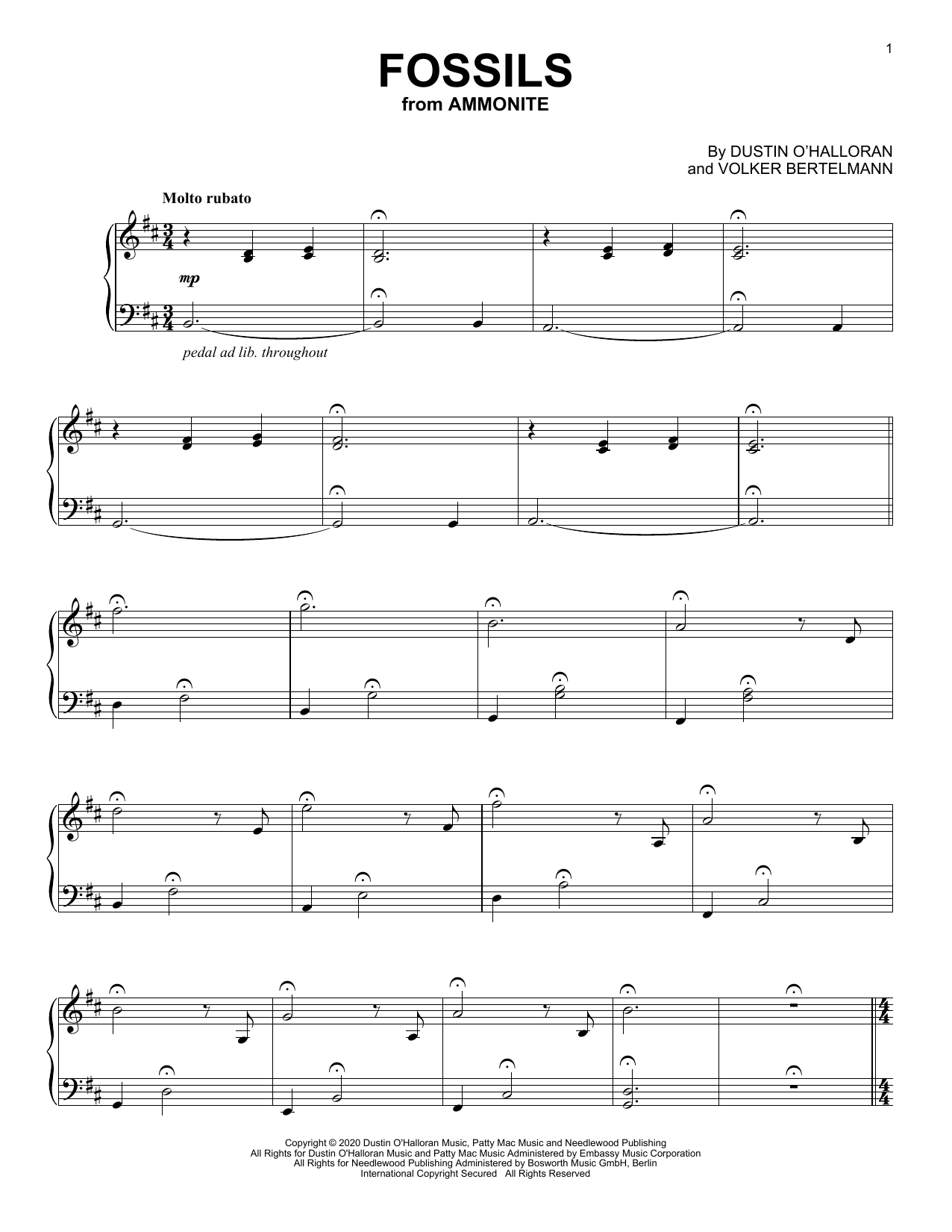 Download or print Dustin O'Halloran & Volker Bertelmann Fossils (from Ammonite) sheet music, chords and digital score arranged for Piano Solo. This Film/TV score includes 4 page(s).