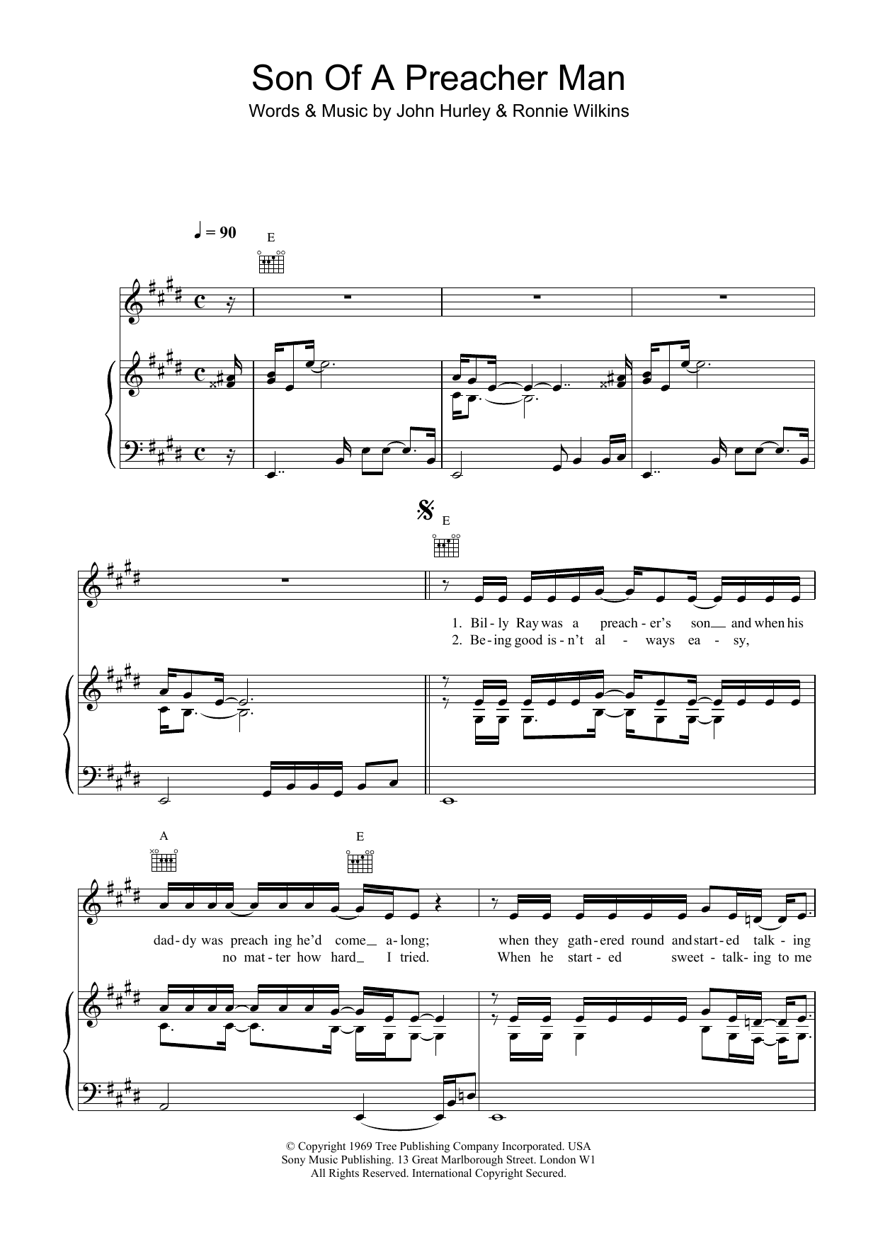 Download or print Dusty Springfield Son-Of-A-Preacher Man sheet music, chords and digital score arranged for Piano, Vocal & Guitar Chords (Right-Hand Melody). This Film/TV score includes 4 page(s).
