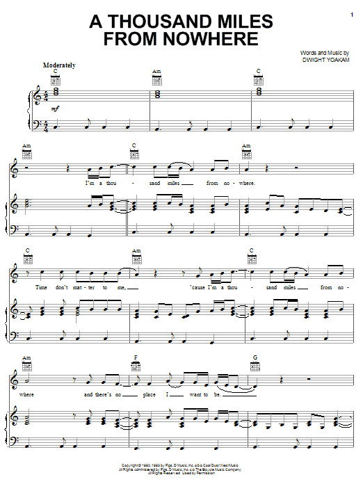 Download or print Dwight Yoakam A Thousand Miles From Nowhere sheet music, chords and digital score arranged for Piano, Vocal & Guitar Chords (Right-Hand Melody). This Country score includes 4 page(s).