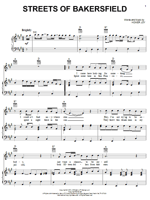 Download or print Dwight Yoakam & Buck Owens Streets Of Bakersfield sheet music, chords and digital score arranged for Piano, Vocal & Guitar Chords (Right-Hand Melody). This Country score includes 3 page(s).