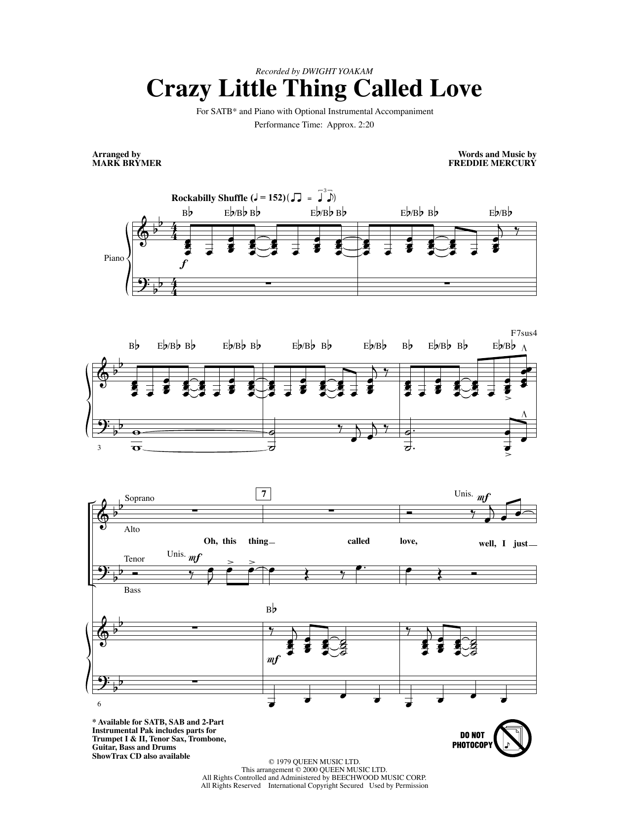 Download or print Dwight Yoakam Crazy Little Thing Called Love (arr. Mark Brymer) sheet music, chords and digital score arranged for SAB Choir. This Rock score includes 10 page(s).