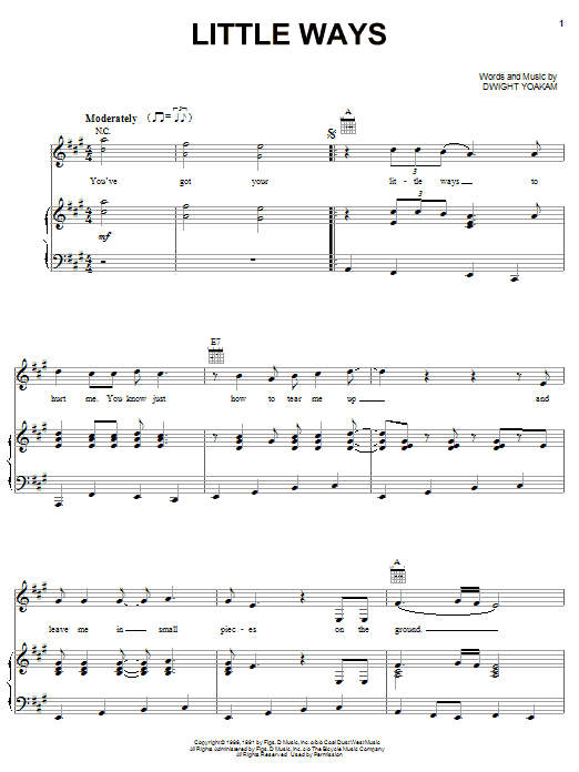 Download or print Dwight Yoakam Little Ways sheet music, chords and digital score arranged for Piano, Vocal & Guitar Chords (Right-Hand Melody). This Country score includes 4 page(s).