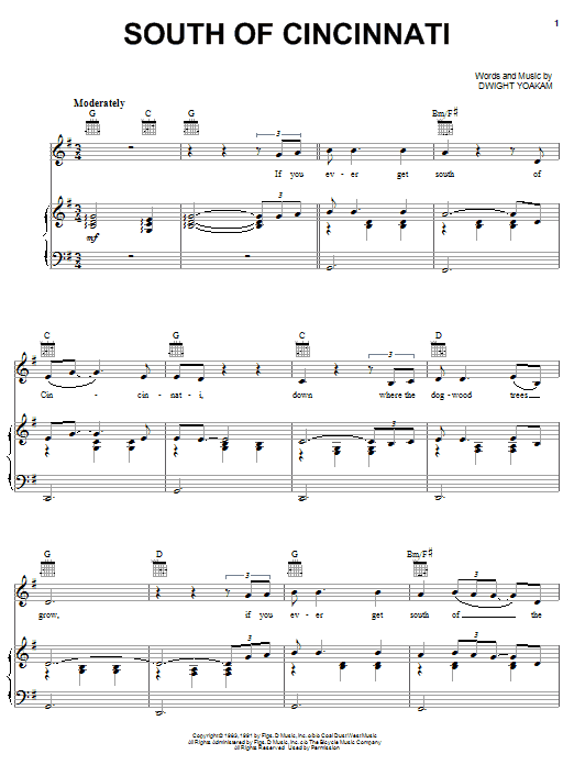 Download or print Dwight Yoakam South Of Cincinnati sheet music, chords and digital score arranged for Piano, Vocal & Guitar Chords (Right-Hand Melody). This Country score includes 6 page(s).
