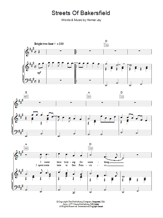 Download or print Dwight Yoakam Streets Of Bakersfield sheet music, chords and digital score arranged for Piano, Vocal & Guitar Chords. This Standards score includes 5 page(s).