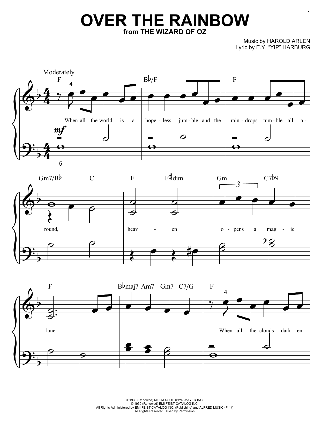 Download or print E.Y. "Yip" Harburg Over The Rainbow sheet music, chords and digital score arranged for Very Easy Piano. This Film/TV score includes 5 page(s).