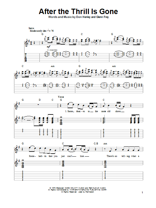 Download or print Eagles After The Thrill Is Gone sheet music, chords and digital score arranged for Guitar Tab. This Pop score includes 12 page(s).