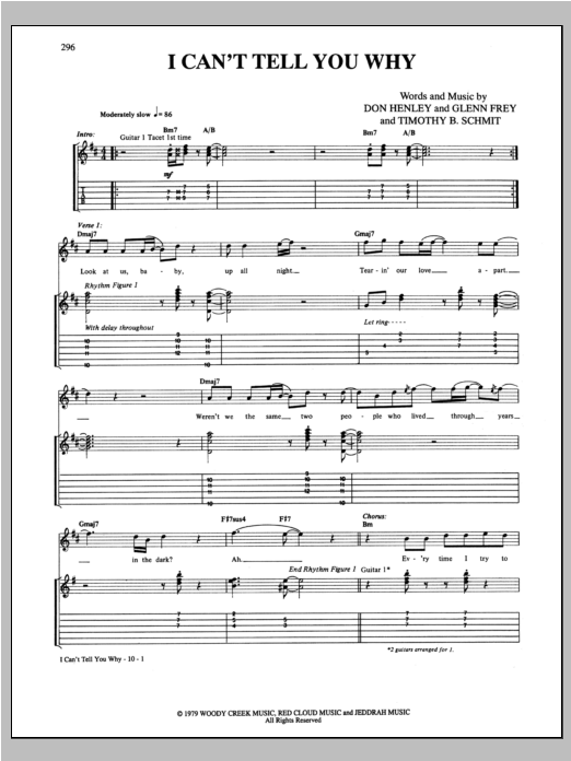 Download or print Eagles I Can't Tell You Why sheet music, chords and digital score arranged for Guitar Tab. This Pop score includes 10 page(s).