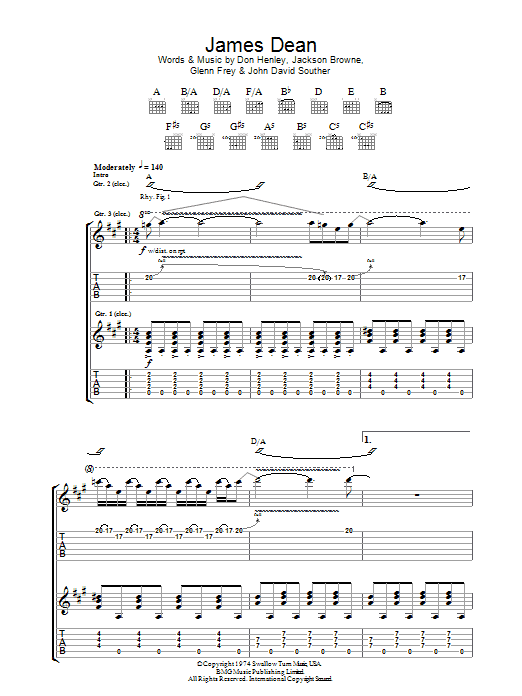 Download or print Eagles James Dean sheet music, chords and digital score arranged for Guitar Chords/Lyrics. This Rock score includes 3 page(s).