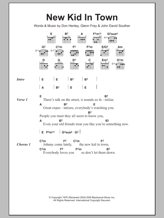 Download or print Eagles New Kid In Town sheet music, chords and digital score arranged for Guitar Chords/Lyrics. This Rock score includes 3 page(s).