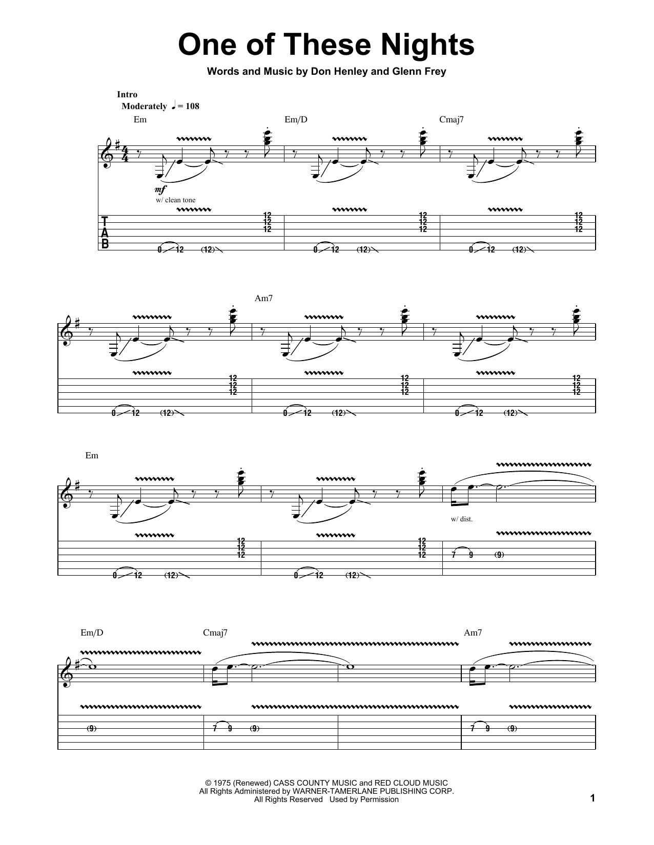 Download or print Eagles One Of These Nights sheet music, chords and digital score arranged for Guitar Tab. This Pop score includes 13 page(s).