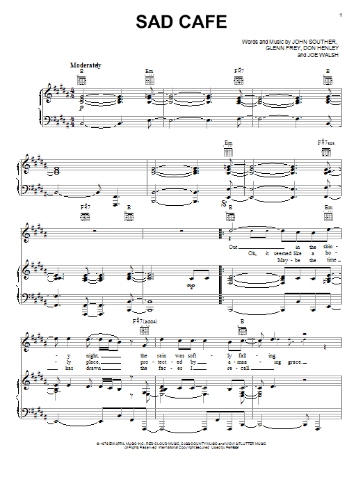 Download or print Eagles Sad Cafe sheet music, chords and digital score arranged for Piano, Vocal & Guitar Chords (Right-Hand Melody). This Pop score includes 6 page(s).