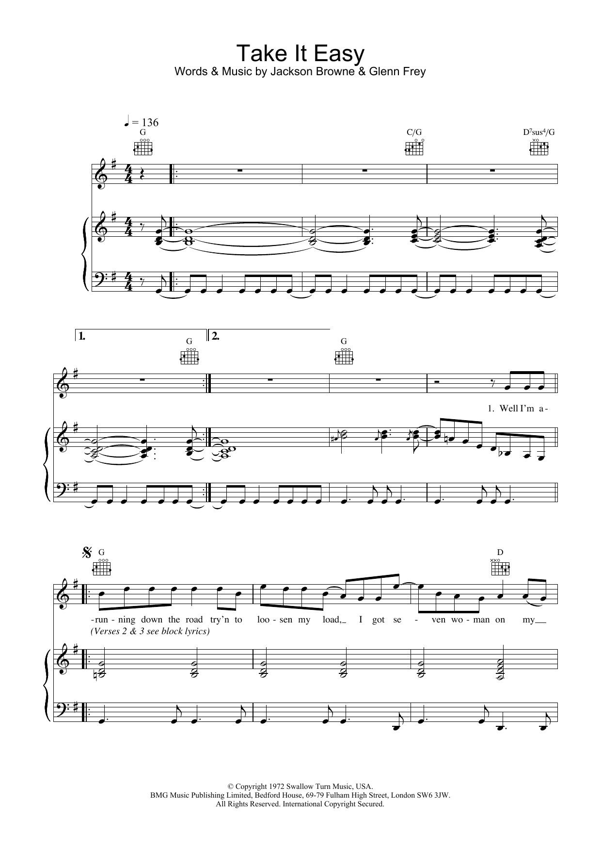Download or print Eagles Take It Easy sheet music, chords and digital score arranged for Guitar Chords/Lyrics. This Rock score includes 2 page(s).