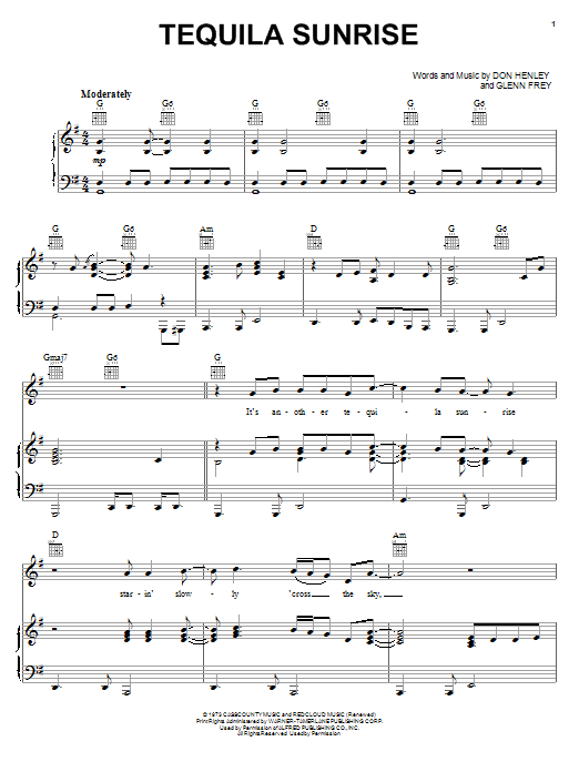 Download or print The Eagles Tequila Sunrise sheet music, chords and digital score arranged for Piano, Vocal & Guitar Chords (Right-Hand Melody). This Pop score includes 6 page(s).