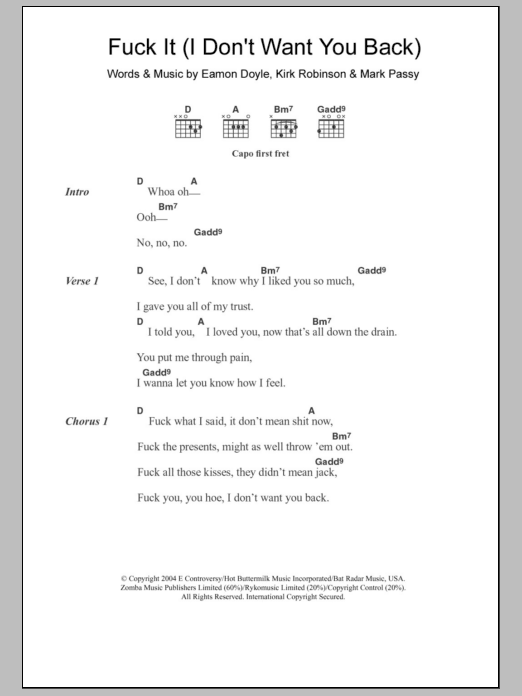 Download or print Eamon F*** It (I Don't Want You Back) sheet music, chords and digital score arranged for Guitar Chords/Lyrics. This Pop score includes 3 page(s).
