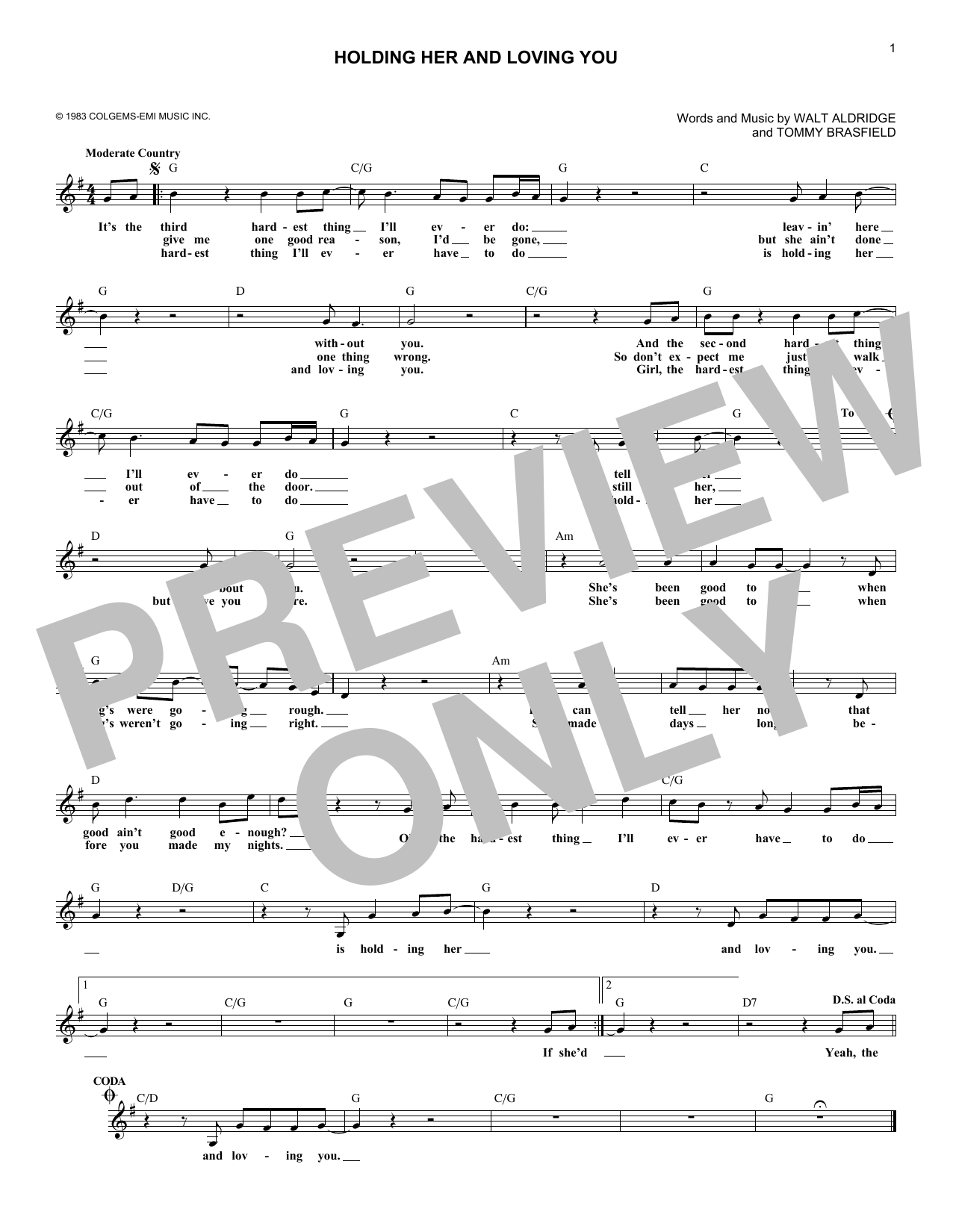 Download or print Earl Thomas Conley Holding Her And Loving You sheet music, chords and digital score arranged for Lead Sheet / Fake Book. This Country score includes 1 page(s).