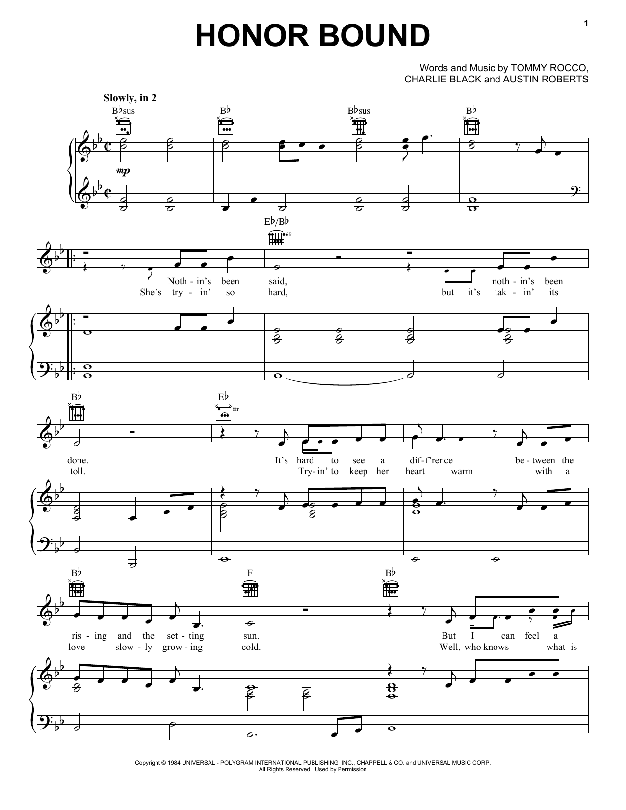 Download or print Earl Thomas Conley Honor Bound sheet music, chords and digital score arranged for Piano, Vocal & Guitar Chords (Right-Hand Melody). This Country score includes 5 page(s).