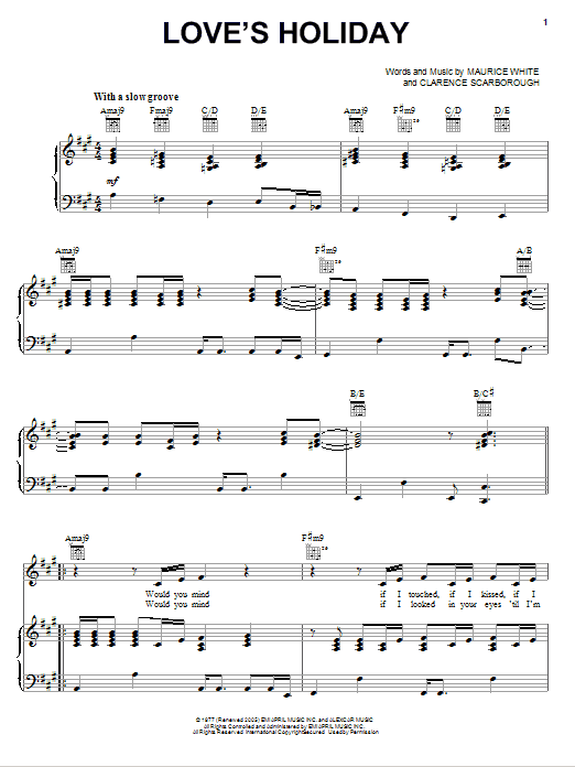 Download or print Earth, Wind & Fire Love's Holiday sheet music, chords and digital score arranged for Piano, Vocal & Guitar Chords (Right-Hand Melody). This Love score includes 6 page(s).
