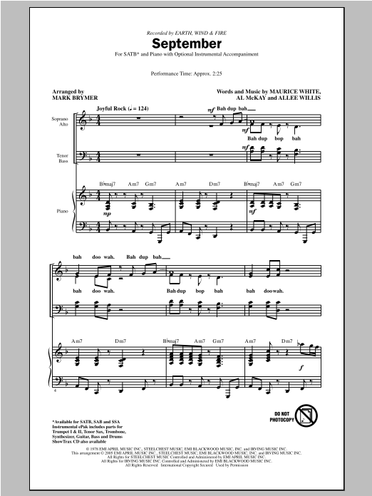 Download or print Earth, Wind & Fire September (arr. Mark Brymer) sheet music, chords and digital score arranged for SAB Choir. This Pop score includes 7 page(s).