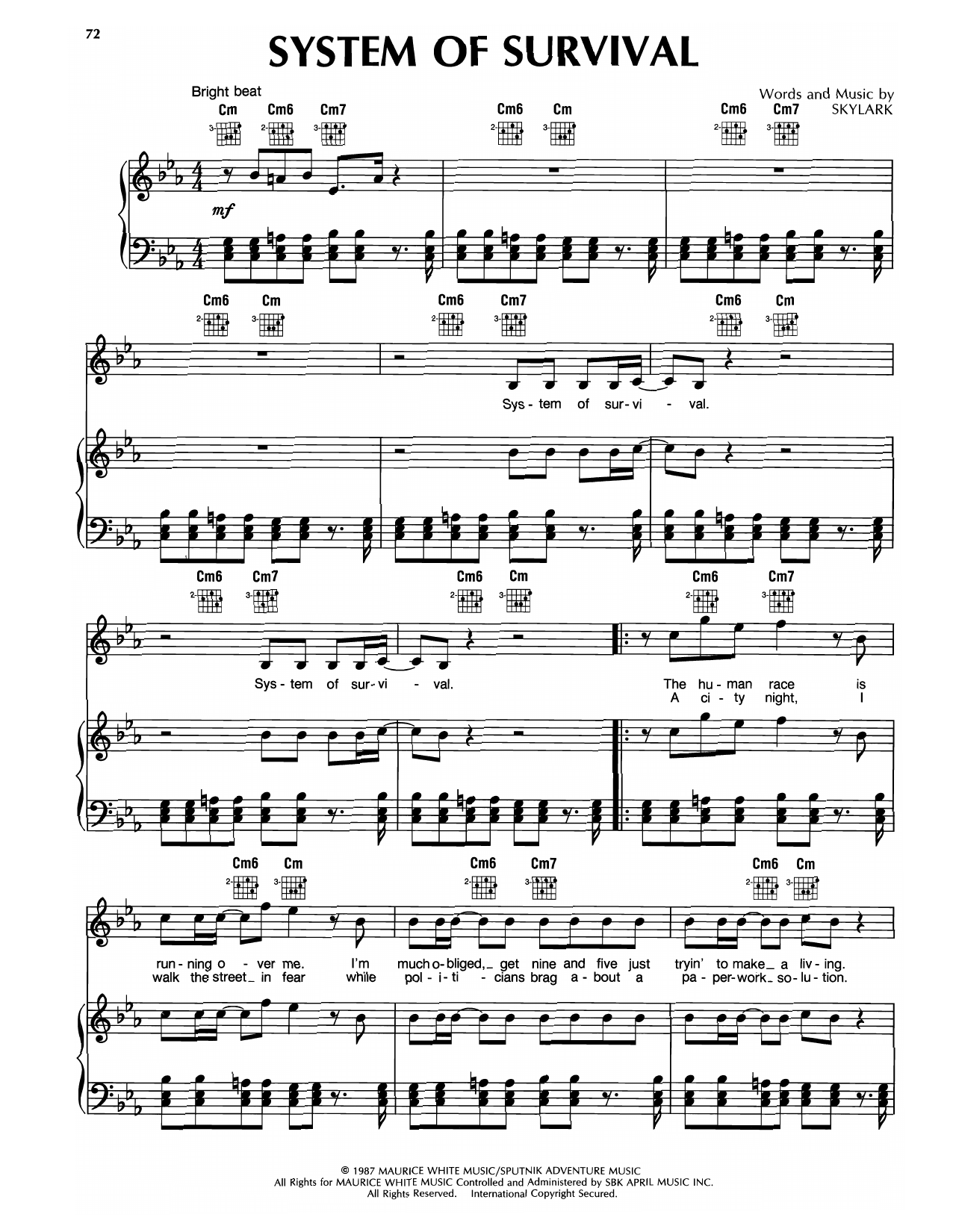 Download or print Earth, Wind & Fire System Of Survival sheet music, chords and digital score arranged for Piano, Vocal & Guitar Chords (Right-Hand Melody). This Pop score includes 5 page(s).