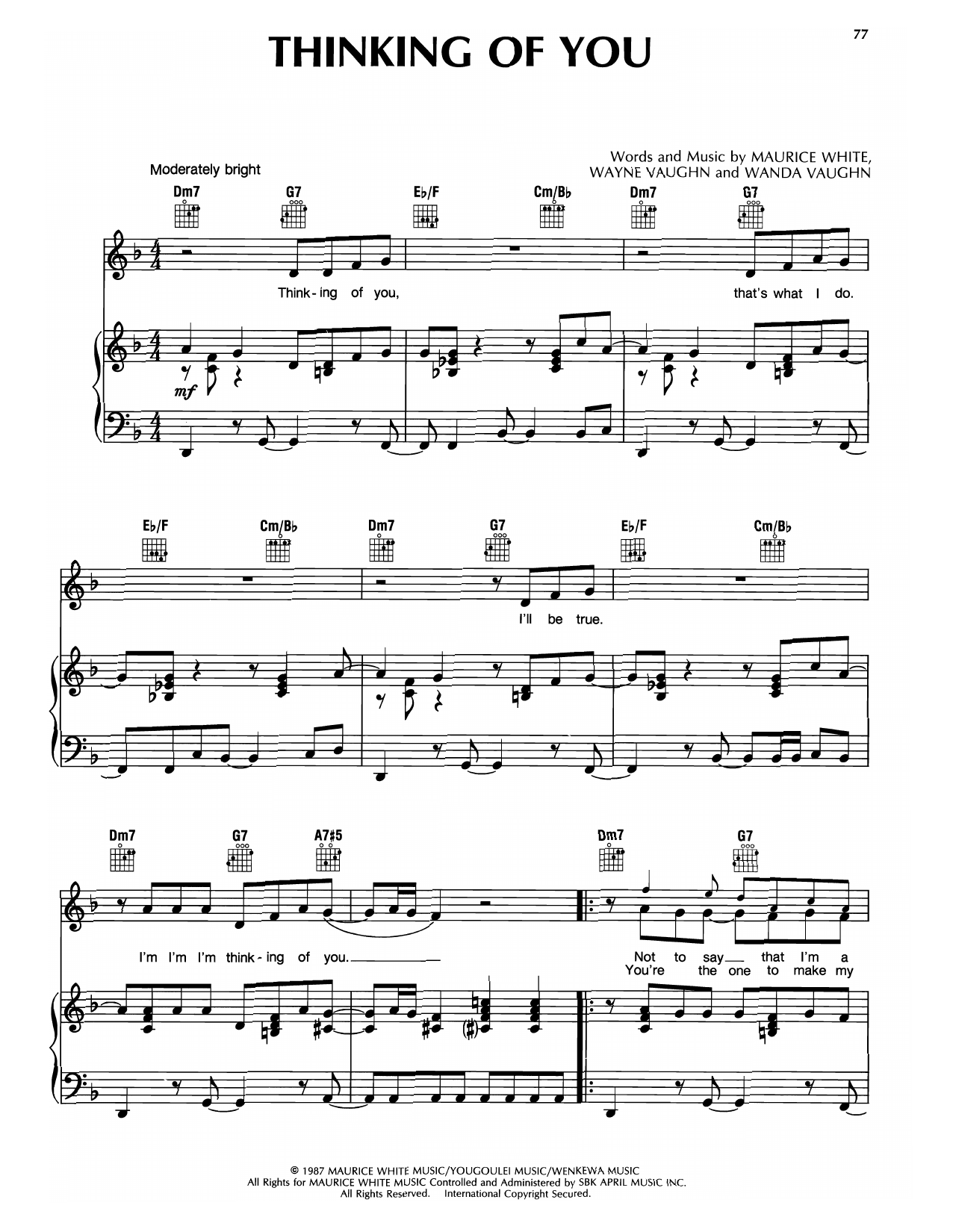 Download or print Earth, Wind & Fire Thinking Of You sheet music, chords and digital score arranged for Piano, Vocal & Guitar Chords (Right-Hand Melody). This Pop score includes 7 page(s).