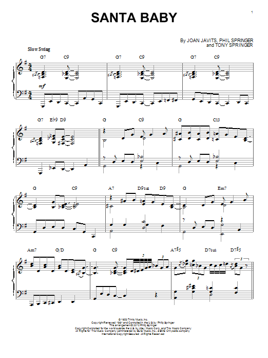 Download or print Eartha Kitt Santa Baby [Jazz Version] (arr. Brent Edstrom) sheet music, chords and digital score arranged for Piano & Vocal. This Christmas score includes 4 page(s).